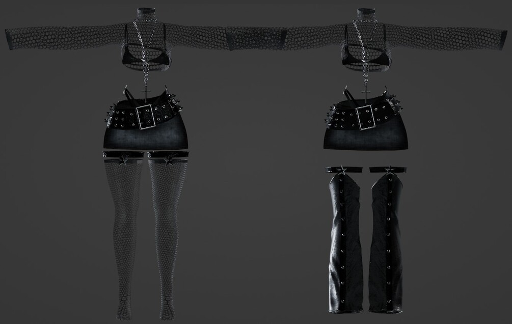 10 FBX files (9 items, 1 full rigged outfit) + multiple textures, normal maps, matcaps + blend file